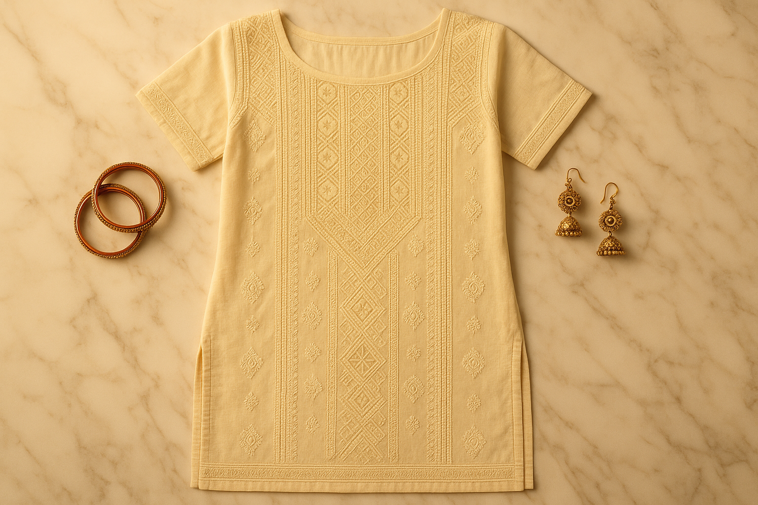 Experience the timeless elegance of authentic Lucknow Chikan embroidery with this exquisite hand-crafted cotton kurti. Each piece showcases the traditional art form passed down through generations of skilled artisans.